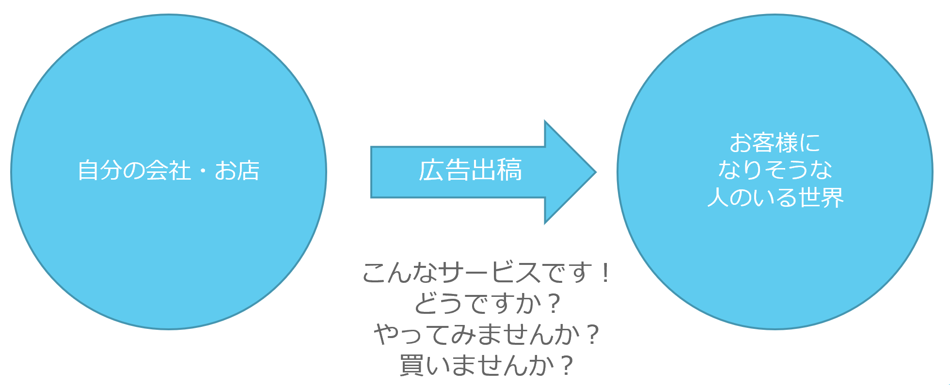 あなたの会社やお店が扱う商品・サービスを「お客様になりそうな人のいる世界」へ向けて「こんなのありますよ。どうですか?」と発信します。ここで言う「お客様になりそうな人」とは、あなたやあなたの会社・お店とこれまでに関りが無い方々を指します。